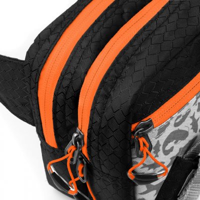 Torba je sašivena od lagane, ali izdržljive crne tkanine. Dizajn torbe nadopunjuje naša jedinstvena siva ATAK! kamuflaža sa siluetama grabežljivih riba.