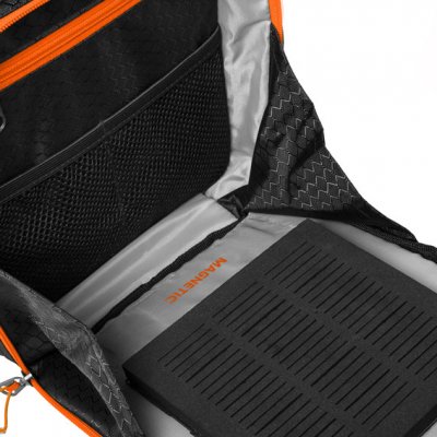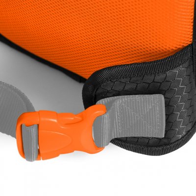 Sa stražnje strane nalazi se podstava u narančastoj boji, također u skladu s patentnim zatvaračima iste boje. Naramenica je crna i opremljena je narančastom plastičnom robusnom kopčom.
