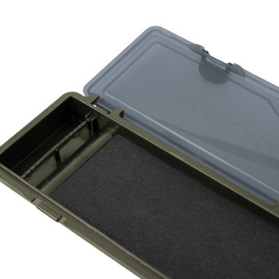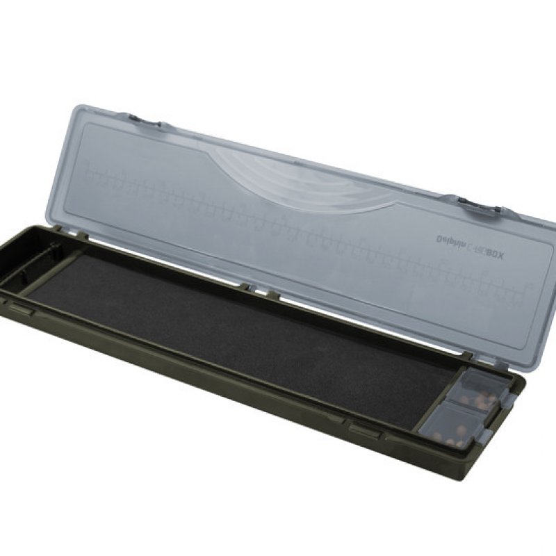 Vrlo praktična čvrsta pernica Delphin C-RIGBOX za šarane. Unutar kućišta se nalazi plastični klik dio za pričvršćivanje udica i pjena dimenzija 260x69mm u koju je moguće pričvrstiti kraj montaže uz pomoć pričvršćenih klinova. Igle sa žutom okruglom glavom nalaze se u dva zatvarača u količini od 20 komada. Pernica tamnozelene boje zatvorena je sivim prozirnim poklopcem na tri šarke s dvije brave. Praktična skala u centimetrima (30 cm) i inčima (12") dostupna je na naslovnici. Povoljan i vrlo praktičan komad opreme ne samo za šaranske ribolovce.