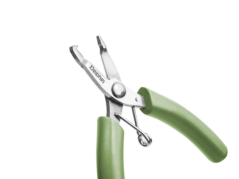 Praktična, višenamjenska kliješta izrađena od nehrđajućeg čelika s gumenim premazom na ručkama za udobno rukovanje. Delphin MINI lako se može nositi s rezanjem pletenih užadi, linija kao i aramidnih (kevlarskih) vlakana. Mikrozubi s unutarnje strane čeljusti koriste se za držanje ribarske linije i kasnije glatko rezanje. Kliješta se također mogu koristiti za razdvajanje SPLITIRANIH prstenova .
