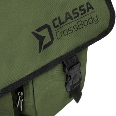 Univerzalna i praktična "cross body" torba pogodna za sve ribolovce, lovce, ali i  za svakodnevnu upotrebu, bilo da je nosite na posao, školu ili u kupovinu. Glavni interijer pruža dovoljno prostora za odlaganje i nošenje raznih dodataka. Osim toga ima i drugi crni džep s patentnim zatvaračem, tako da možete učinkovito odvojiti stvari unutar torbe. CLASSA CrossBody opremljen je s dva odvojena džepa s kvalitetnim dvostrukim patentnim zatvaračima sprijeda. Torba je dizajnirana u tamno zelenoj boji u kombinaciji s crnim elementima kao što su kopče, patentni zatvarači, naramenica i prepoznatljiv logo. Cijeli donji dio i stranice do visine od 5 cm opremljeni su visokokvalitetnim vodootpornim materijalom. To znači da ne postoji opasnost od prljanja ili oštećenja vrećice čak i kada je stavite na mokro ili prljavo tlo. Zahvaljujući svojoj svestranosti i kompaktnosti, naći će svoju upotrebu od strane brojnih ljudi u raznim aktivnostima.