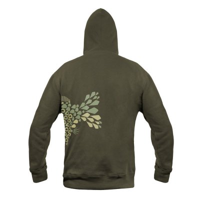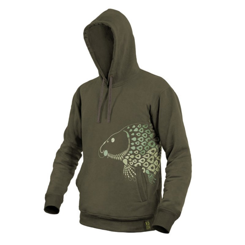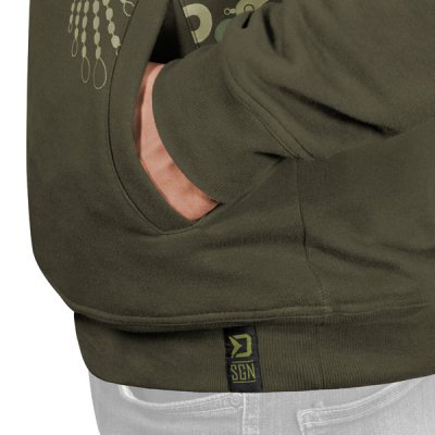 Izrađena je od tamnozelenog materijala, koji se savršeno uklapa u prirodni okoliš. Motiv šarana prikazan na trenirci u potpunosti je sastavljen od pojedinačnih elemenata šaranskog sklopa, kao što su okretaji, olovka, kravata i slično. To čini Delphin TACKLE prepoznatljivim i uistinu jedinstvenim komadom među odjećom za šarane. U prednjem dijelu ima dva džepa koji vam omogućuju grijanje ruku po hladnom vremenu, ali i spremanje i prijenos raznih stvari.